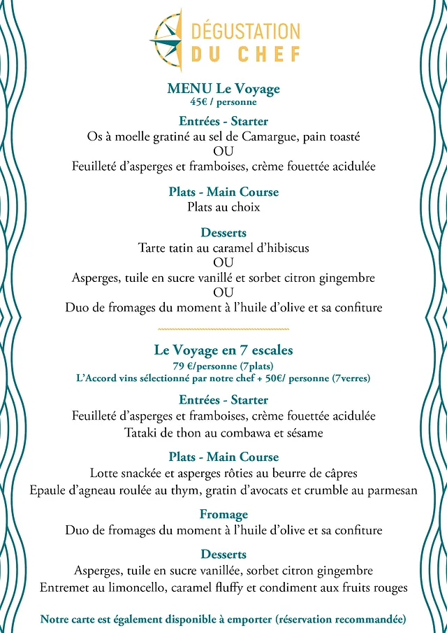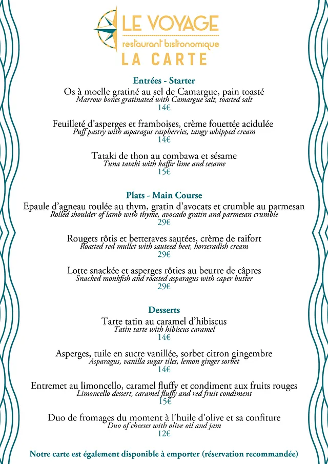 Le Restaurant Le Voyage à Martigues et ses alentours vous propose une cuisine bistronomique de qualité. Chaque mois, notre carte se renouvelle pour vous offrir une sélection variée de 3 entrées, 3 plats et 3 desserts. De plus, chaque lundi, mardi, jeudi et vendredi midi, un plat du jour est proposé en plus de la carte. Venez découvrir notre cuisine raffinée et délicieuse !