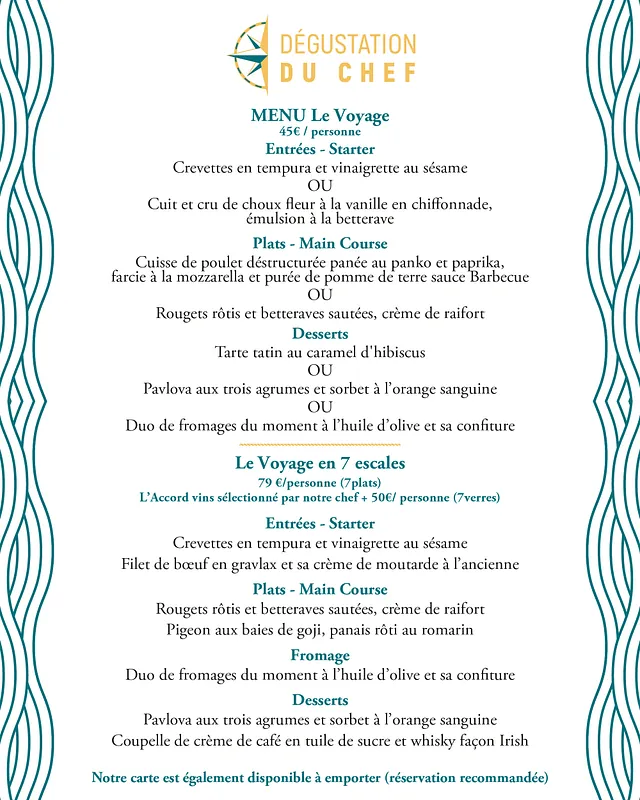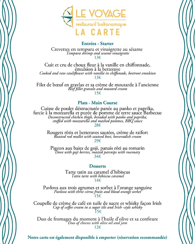 Au Restaurant Le Voyage, nous vous invitons à découvrir les saveurs d'une aventure culinaire unique. Nous proposons des produits frais de saison en circuit court pour vous offrir des plats de qualité. Notre carte change chaque mois afin de vous offrir une variété de plats savoureux et de vous inviter à un voyage gustatif. En plus de notre carte, nous proposons un plat du jour chaque lundi, mardi, jeudi et vendredi midi pour vous offrir une expérience culinaire exceptionnelle.