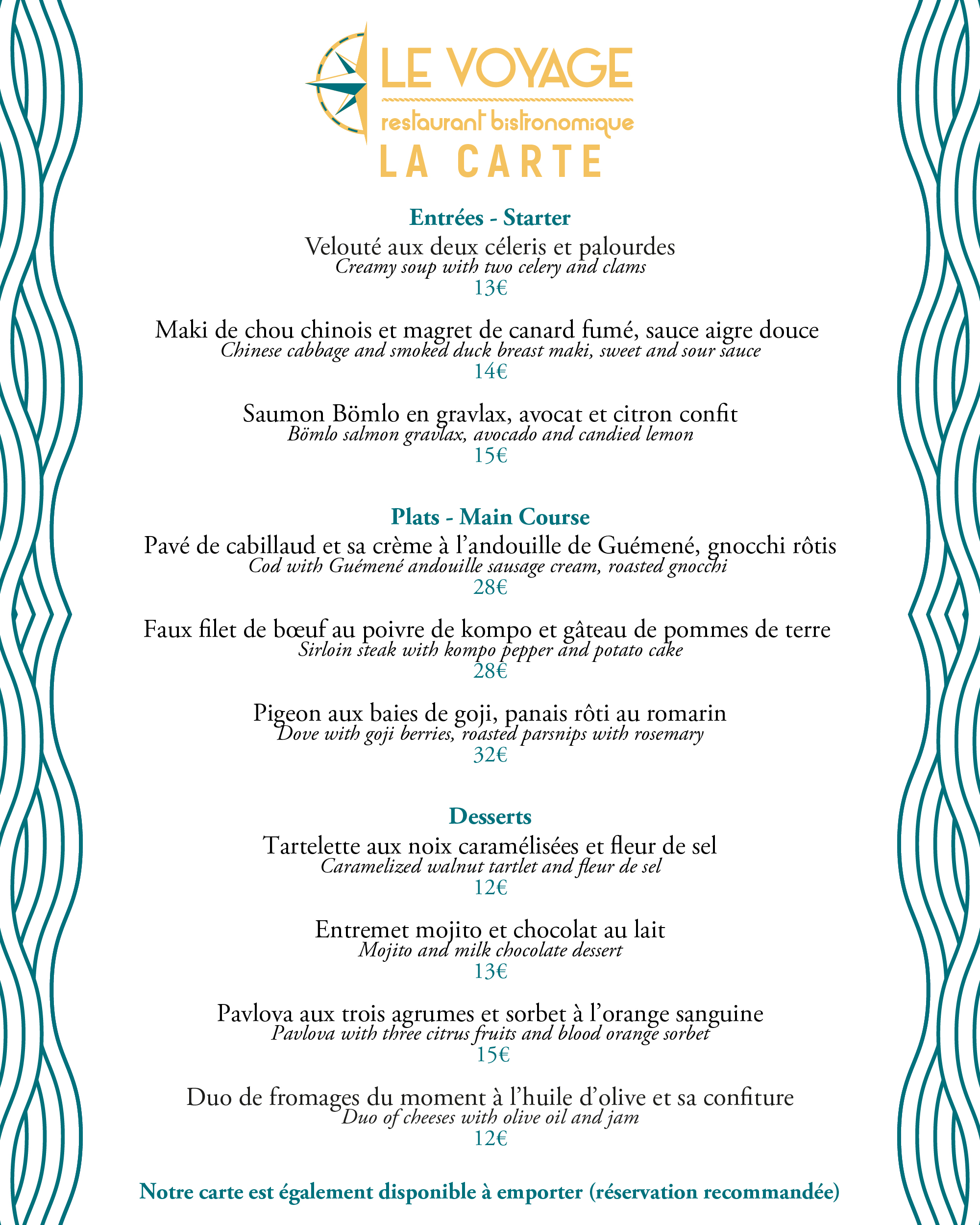 Le Restaurant Le Voyage à Martigues et ses alentours propose une carte variée qui change chaque mois. Dégustez 3 entrées, 3 plats et 3 desserts, et profitez du plat du jour proposé du lundi au vendredi midi. Venez découvrir notre cuisine bistronomique fraîche et variée.